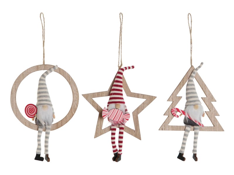 Colgantes decorativos navideños de gnomos navideños en color rojo y gris. Realizados en madera natural y muñecos de peluche. Disponibles tres modelos. Medidas: 16,5x4x30 cm