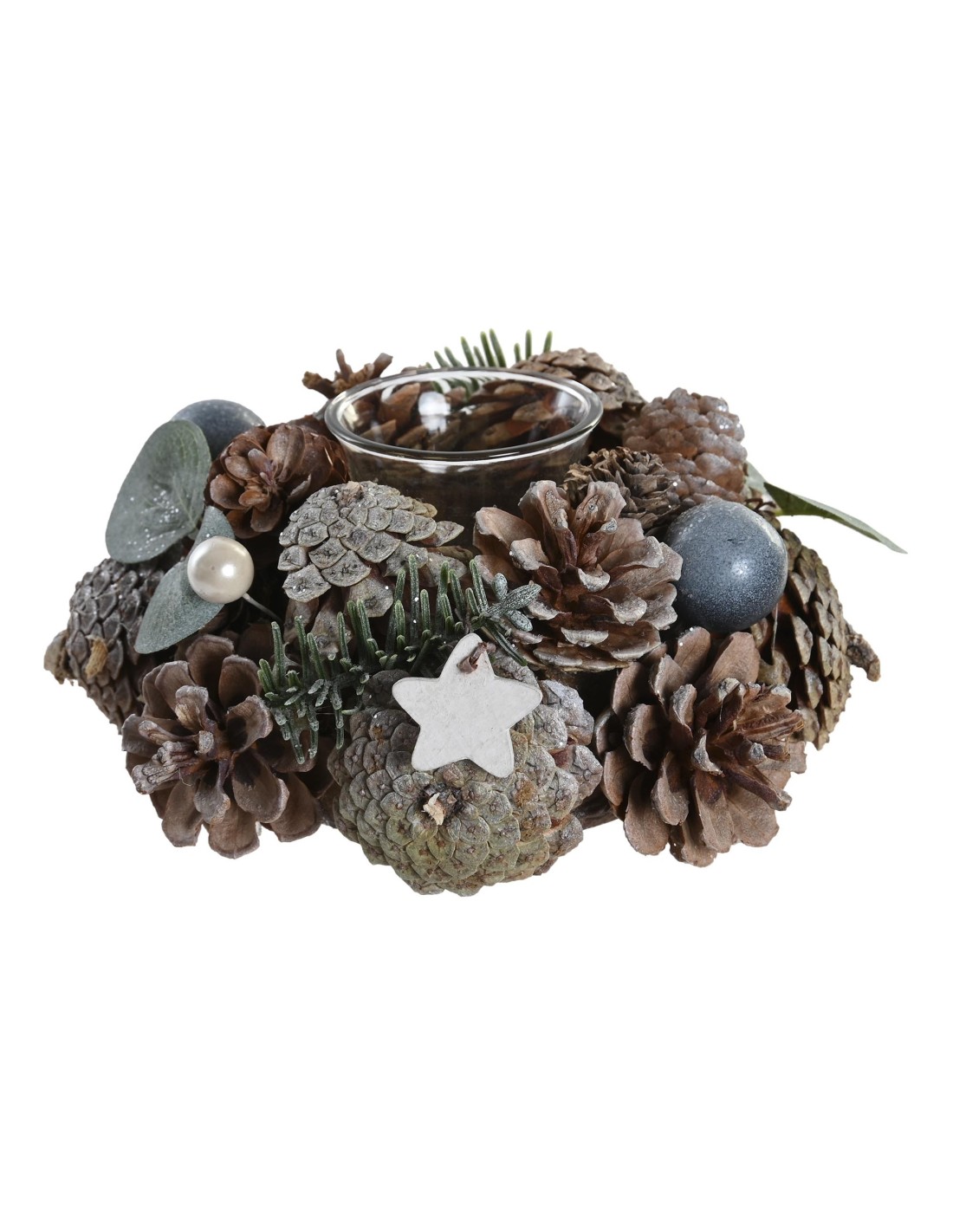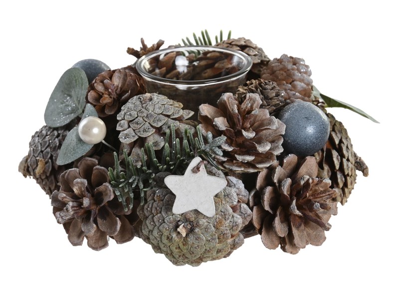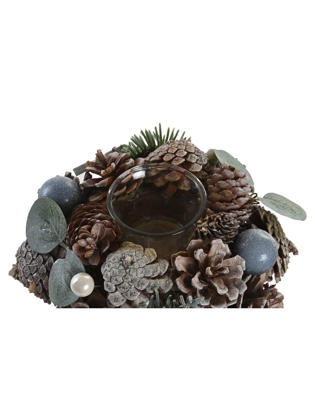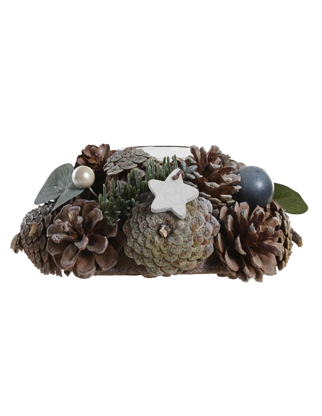 Centro navideño con portavela de cristal realizado con piñas naturales. Medida: 19x19x9 cm