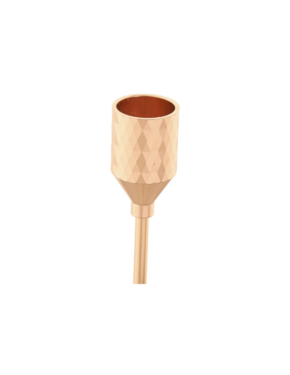 Juego de dos candelabros con diferente altura. Realizados en metal rosado y peana de mármol color natural. Medida: 4x4x29, 4x4x25 cm