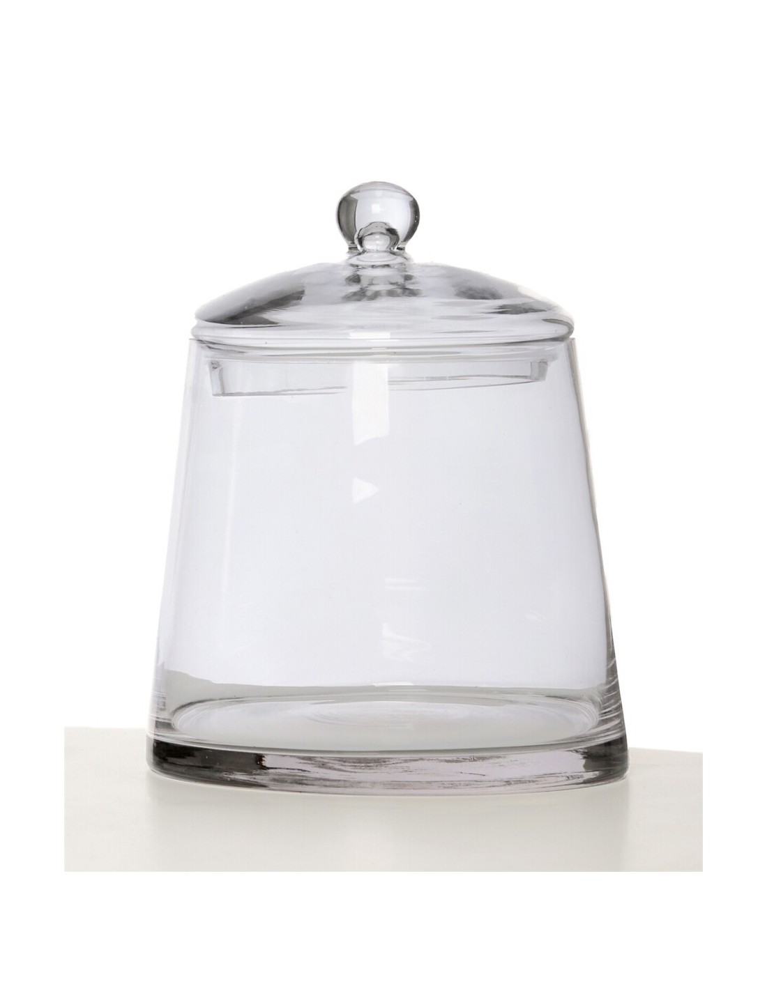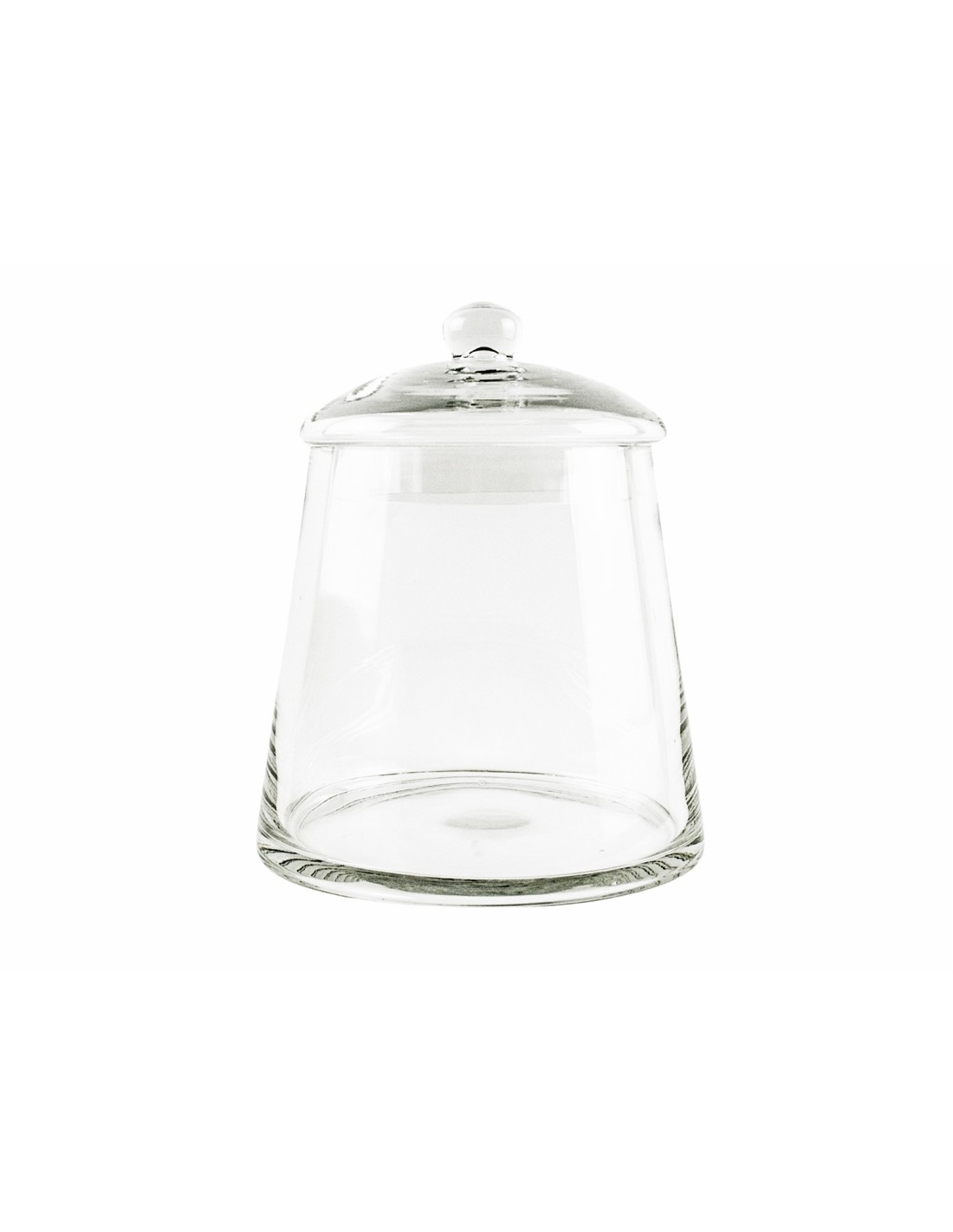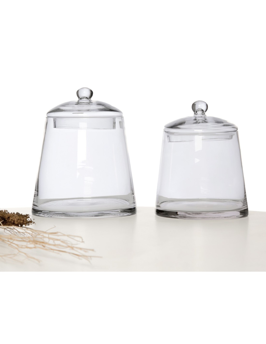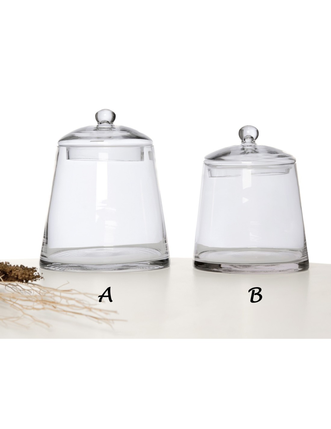 Tarros con tapa realizados en cristal de forma cilíndricos. Medida A: 25cm, Medida B: 22 cm.