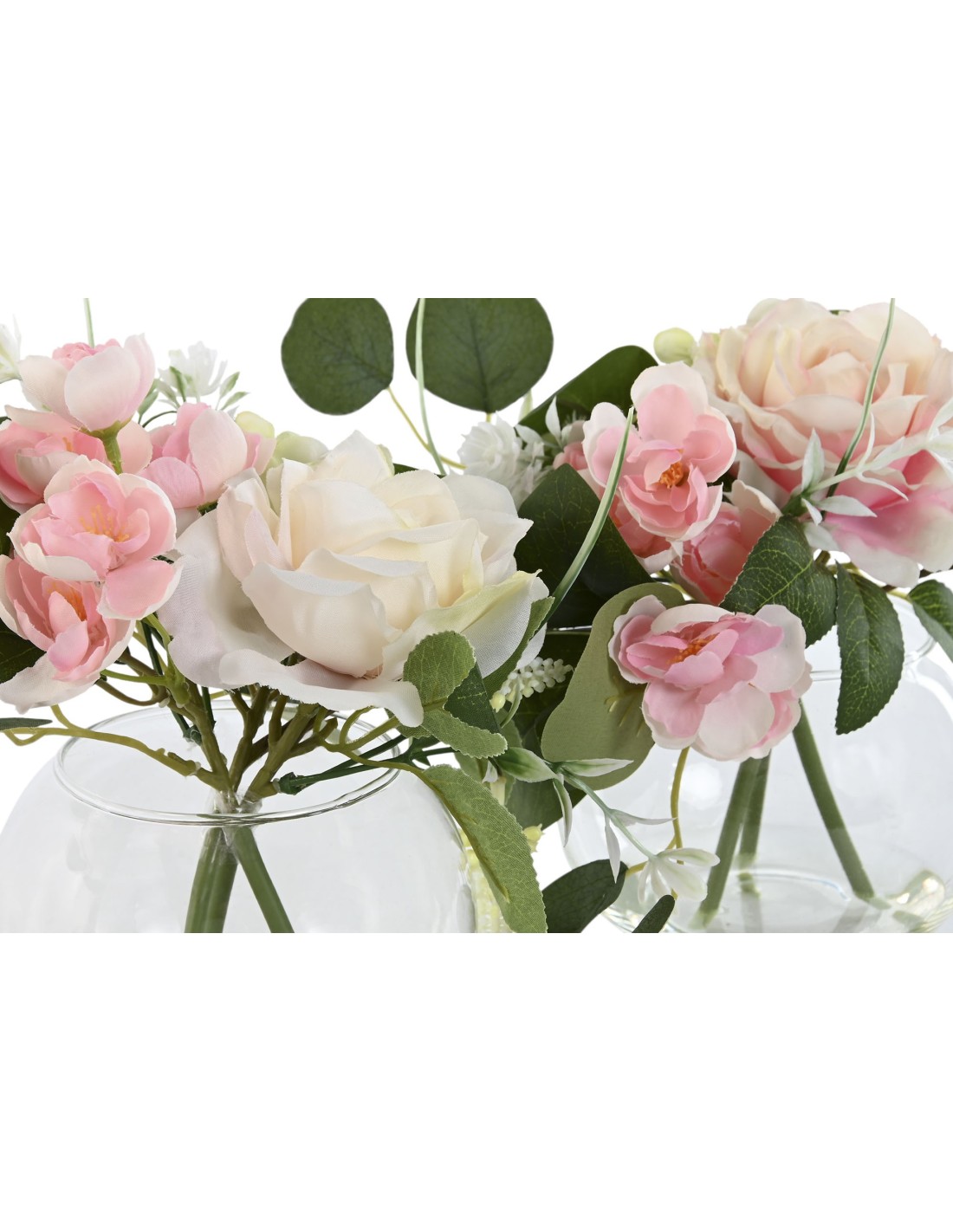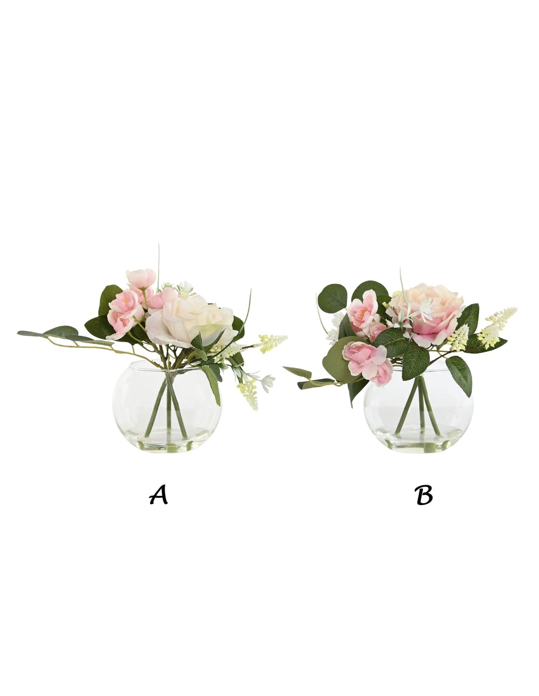 Jarrón de cristal con bouquet de flores y símil de agua. Disponible en rosa y blanco. Medida:24x20x23 cm