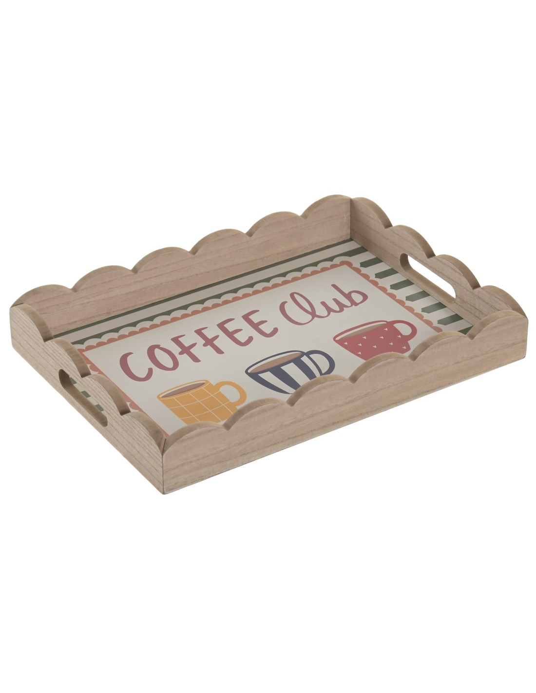 Bandeja con asas para servir decorada con motivos coffee club multicolor. Medida: 35x25x5 cm