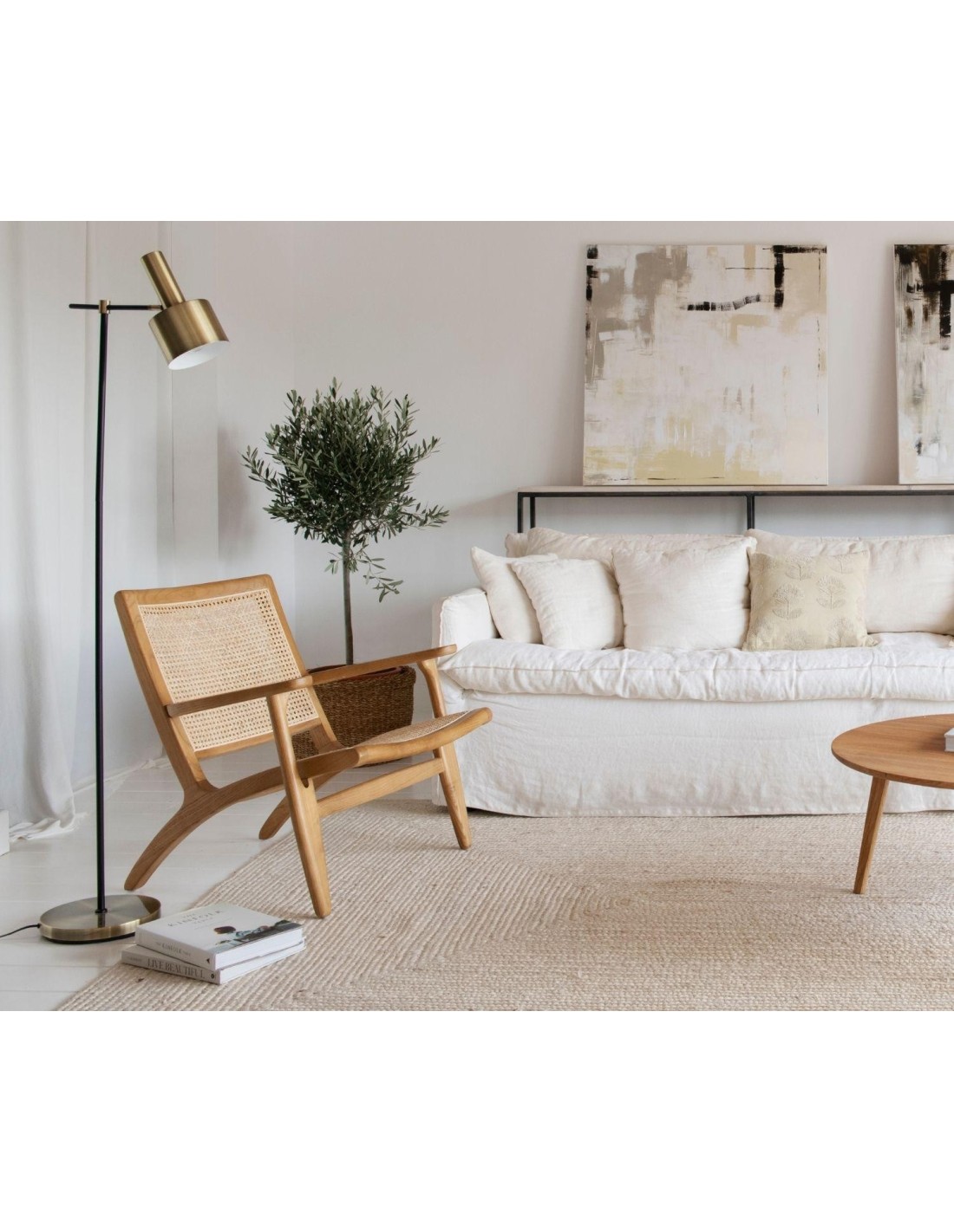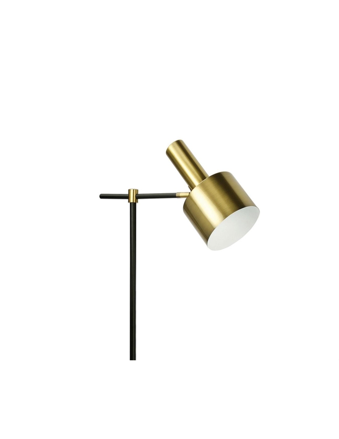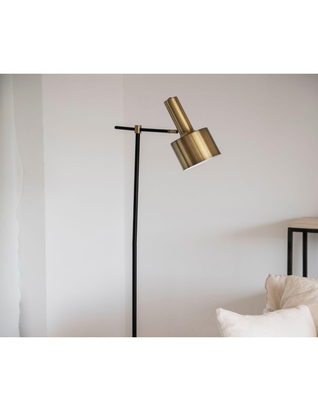 Esta lámpara de pie de estilo nórdico consta de una base circular y pantalla cilíndrica con brazo articulado en metal dorado y cuerpo en metal negro. De líneas puras, esta pieza no solo es funcional, sino que aporta calidez a cualquier habitación. Ideal como elemento que destaca en salones o dormitorios de colores neutros y decoración nórdica, consigue convertirse en la iluminación perfecta para cualquier estancia. Esta lámpara también tiene una versión en lámpara de mesa.