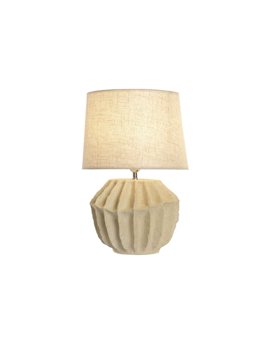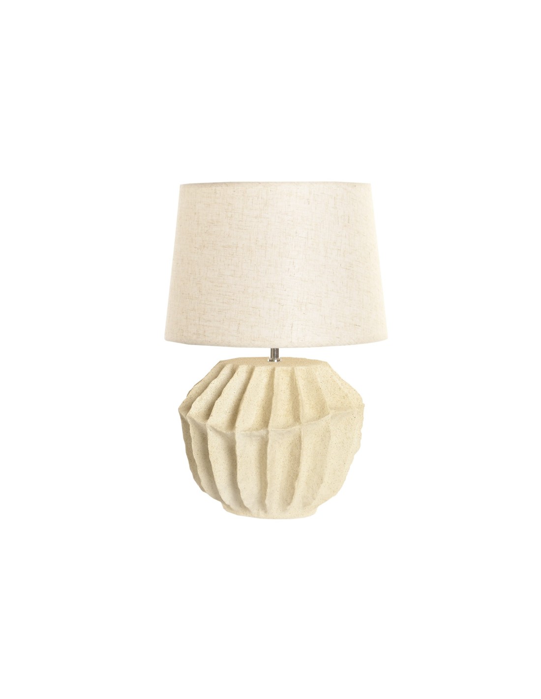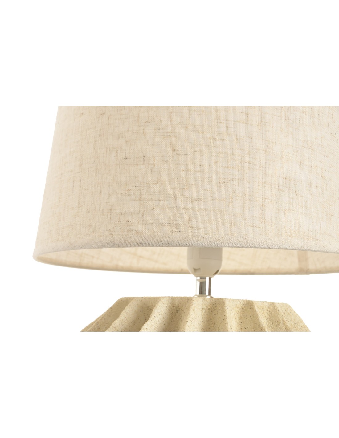 Lámpara de sobremesa realizada en resida y textura arenosa. Color beige. Pantalla de poliéster efecto lino. Medida: 36x36x52 cm