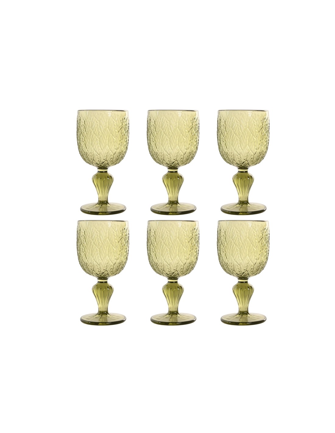 Juego de 6 copas de cristal con motivos de hojas verdes en relieve. Medida:8x8x17 cm 340ML