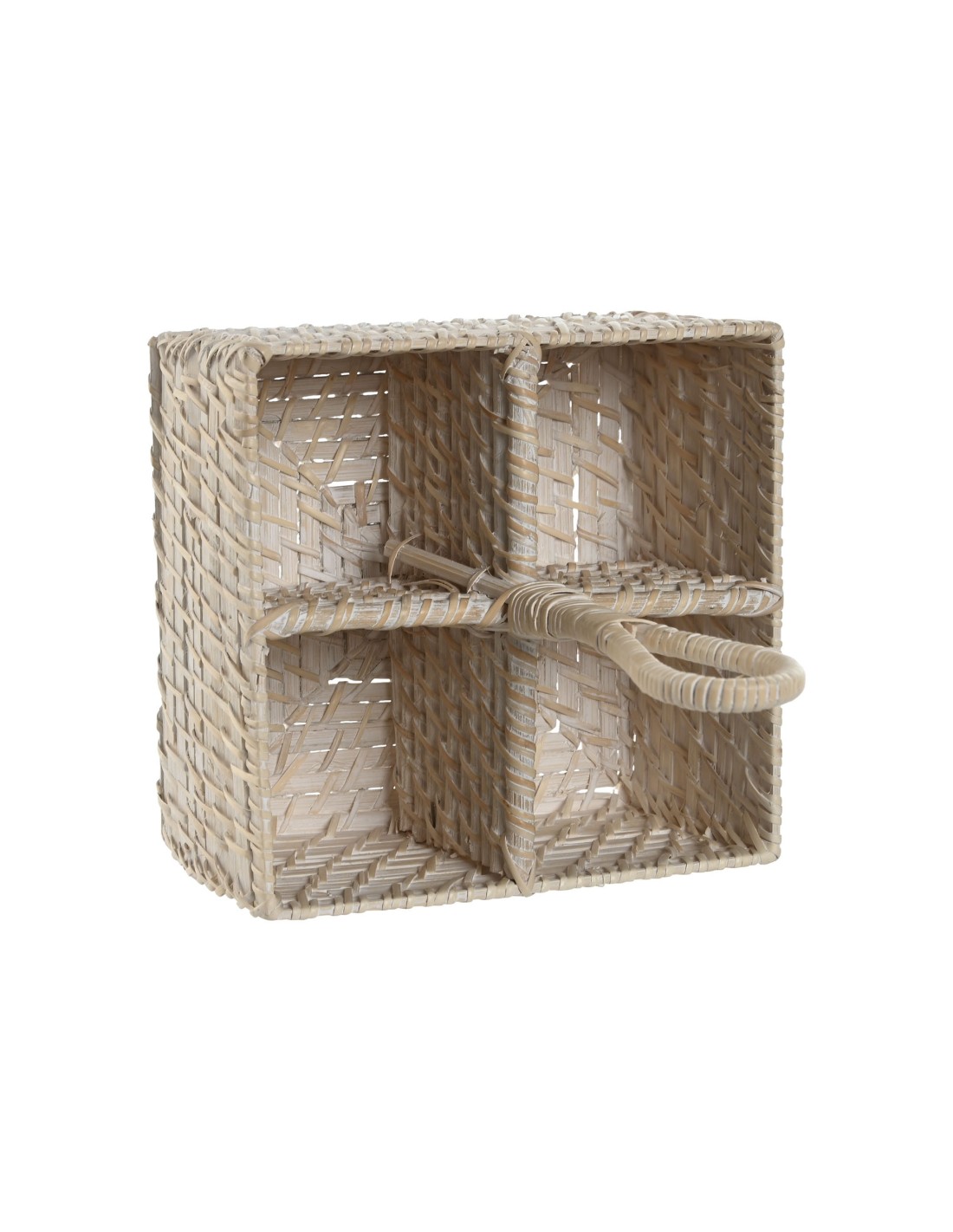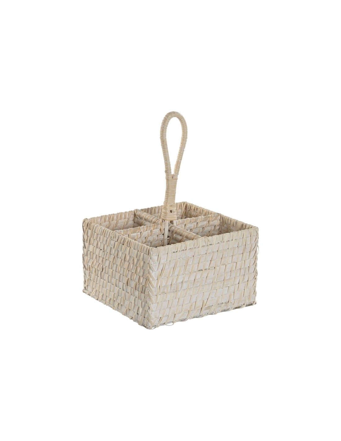 Cubertero con asa con 4 compartimentos. Realizado en bambú y ratán de color natural decapado en blanco. Medida: 19x19x27 cm