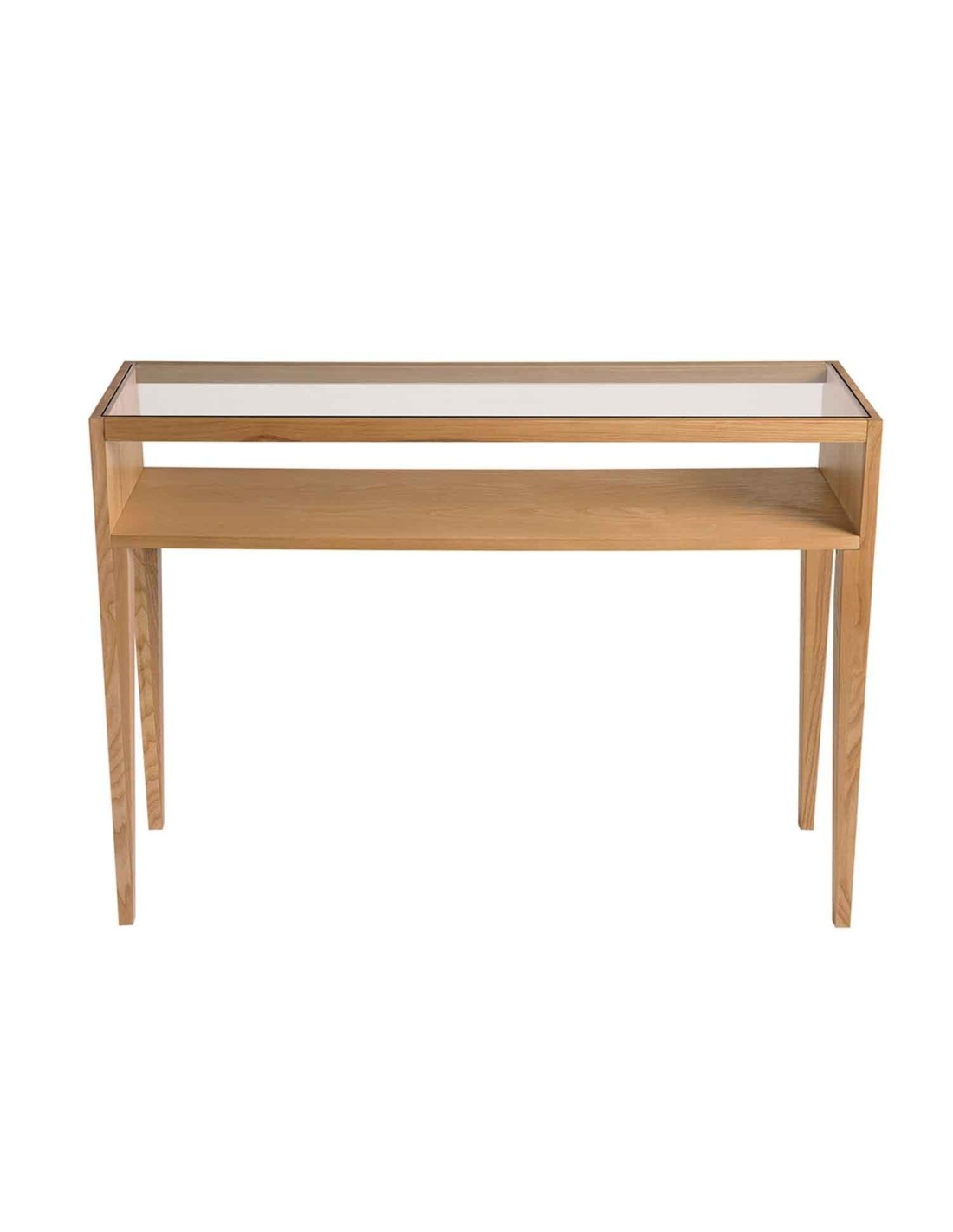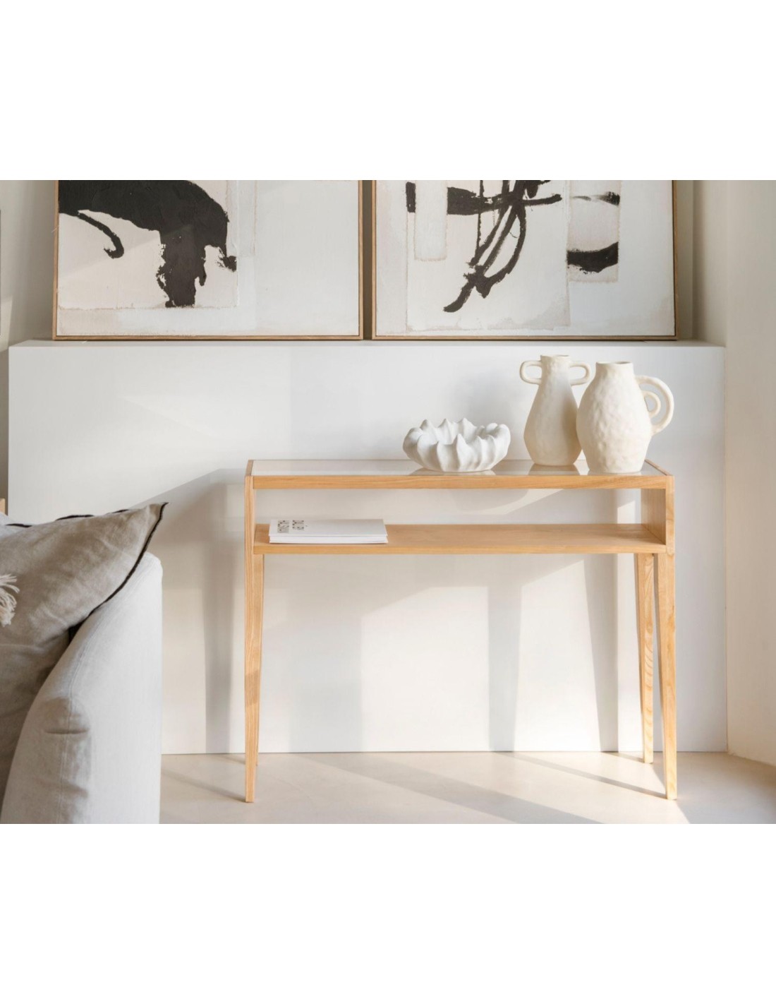La consola de madera de fresno y vidrio es una pieza elegante y funcional, perfecta para dar la bienvenida a tu hogar con estilo. Su diseño ligero, combinado con la calidez de la madera y la transparencia del vidrio, la convierte en una opción ideal para recibidores, pasillos o salones.